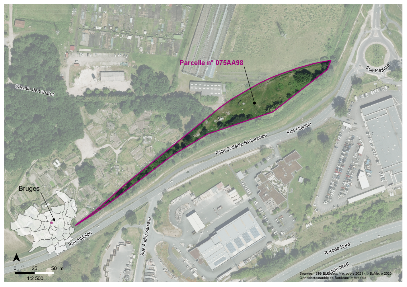 Un grand terrain longeant la rue de Majolan et la piste cyclable Bordeaux-Lacanau, face un secteur d'activités proche de la rocade.
