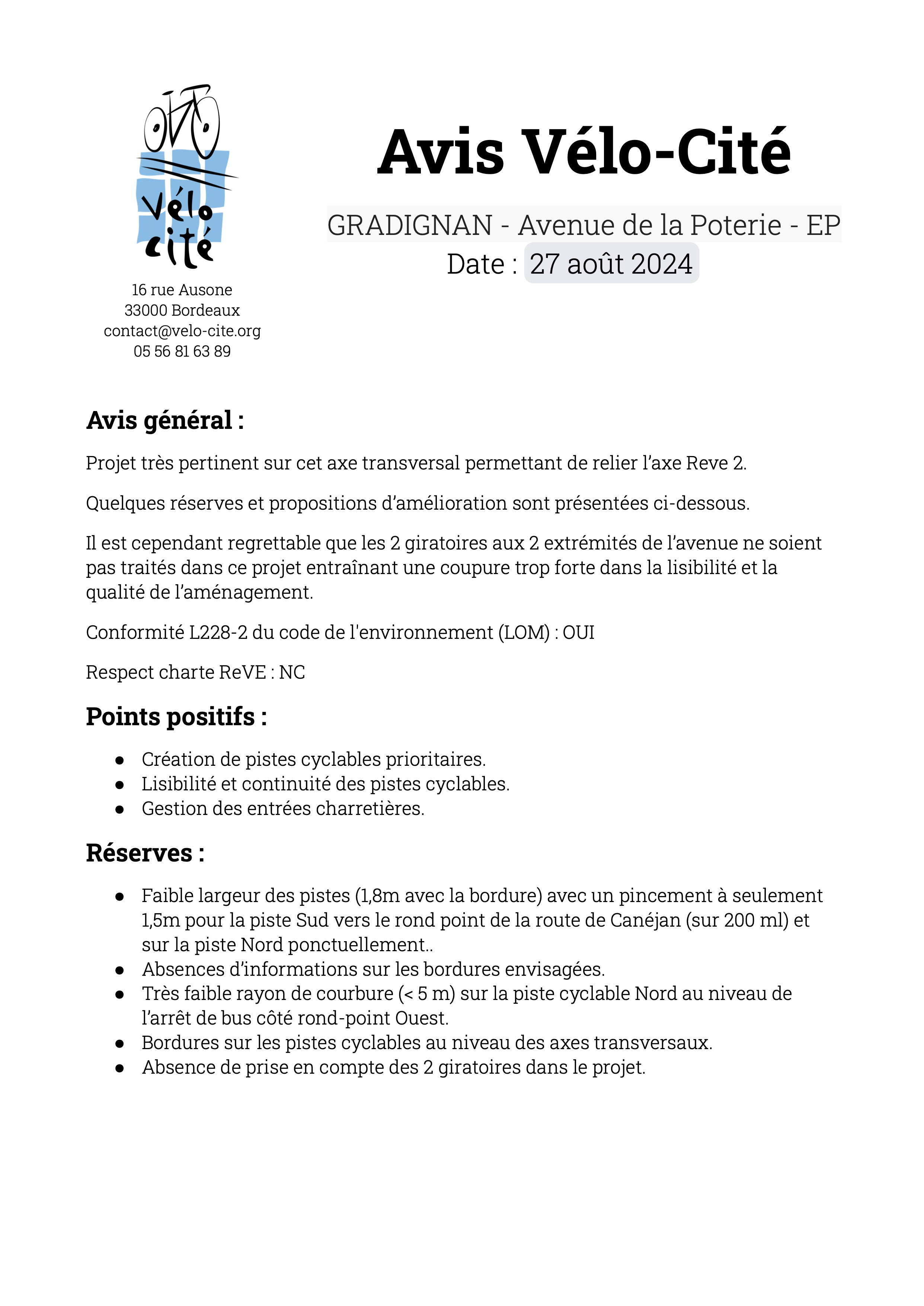 Rappel de l'avis de Vélo-Cité lors de l'EP d'Août 2024: